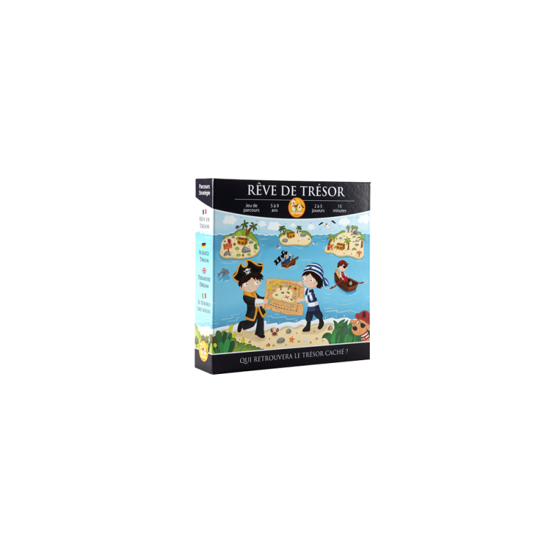 But du jeu : jeu de parcours et de stratégie. Etre le premier à trouver le trésor du pirate, voici une quête des plus palpitantes ! Pour cela, il faut récupérer 3 objets : la carte au trésor, une boussole et la clef du coffre. Une fois les 3 éléments réunis, il faut chercher le trésor caché sur l'une des trois îles. Mais le temps presse car le pirate recherche aussi son trésor.