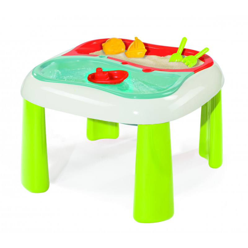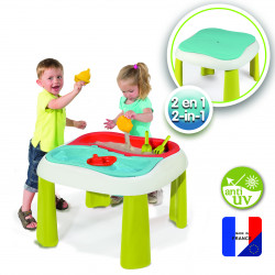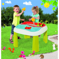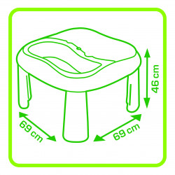 Table de jeux extérieure équipée de 2 bacs amovibles avec couvercles. Parasol adaptable (non fourni). Anti-UV. Dim. de la table (L x l x H) : 69 x 69 x 46 cm.