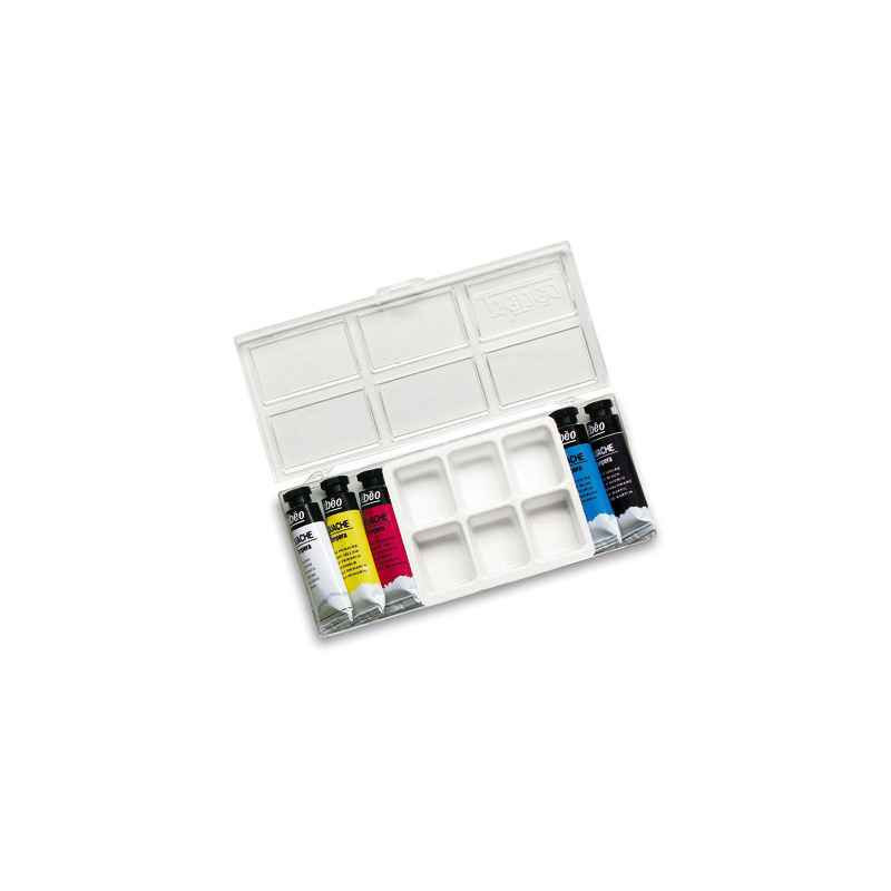 Pâte fine et onctueuse pour une grande facilité d’application. S’utilise pure ou diluée à l’eau. Couleurs opaques et couvrantes qui restent vives et lumineuses après séchage. Étui de 5 tubes de 10 ml - Coloris primaires + noir et blanc + palette de 6 alvéoles
