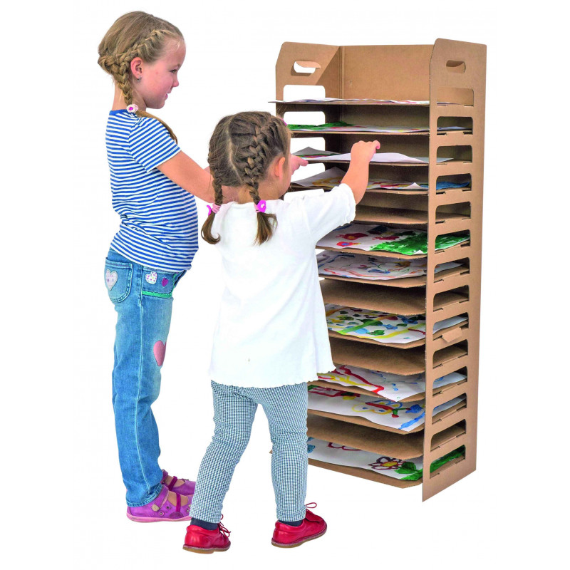 14 dessins peuvent être placés simultanément. Les étagères sont en carton imperméable. Livré à plat.
